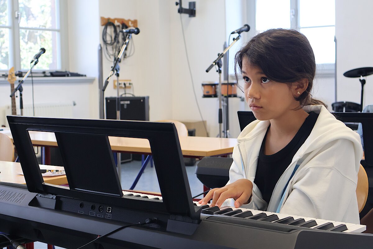 In kleinen Gruppen lernten die Kinder die Vielfalt der Instrumente kennen – und konnten sich natürlich auch selbst ausprobieren. Am Schlagzeug war Taktgefühl gefragt, das einige schon erstaunlich gut unter Beweis stellten. Bei E-Gitarre und Bass wurde gefühlvoll gezupft, und die ersten Töne konnten sich durchaus hören lassen.