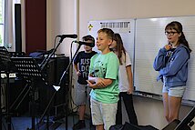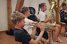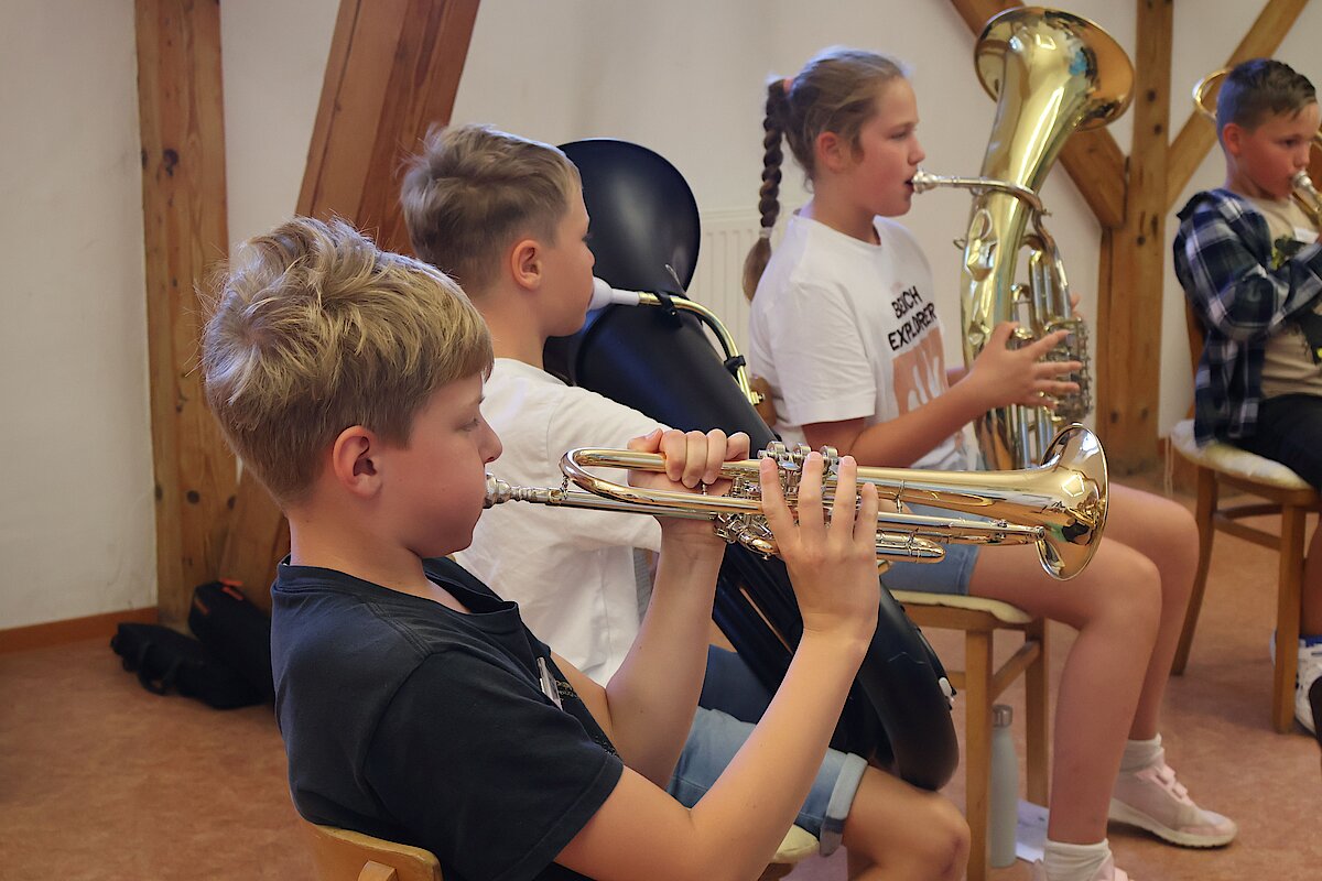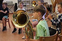 Besonders spannend wurde es im Gesangszimmer: Hier wurden die Stimmen aufgewärmt, und am Mikrofon durfte jeder zeigen, welche Klangfarbe in seiner Stimme steckt. Deutlich lauter ging es bei den Blechbläsern zu – Trompete und Tuba forderten ordentlich Puste, aber auch hier zeigten sich erste Talente.