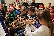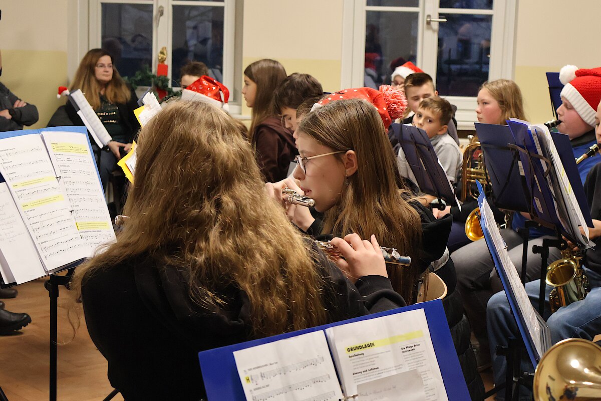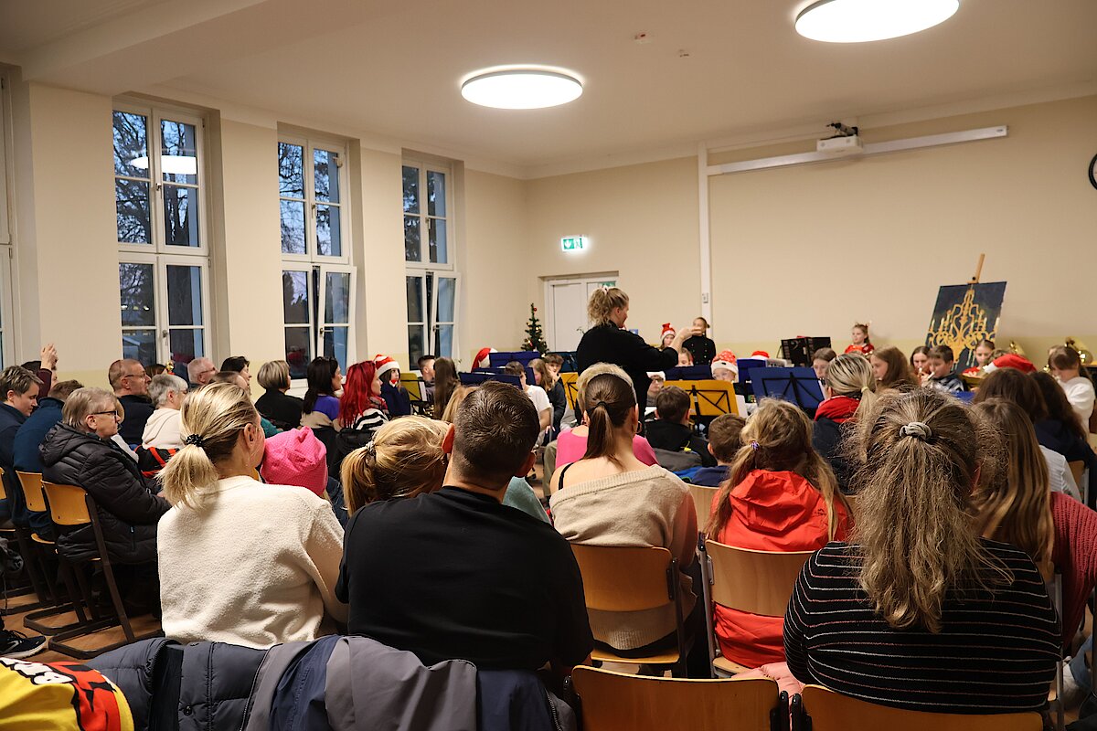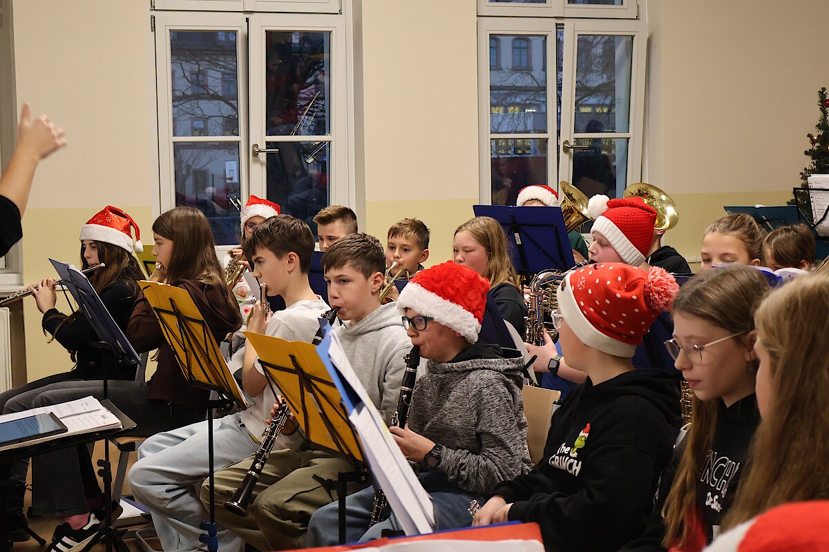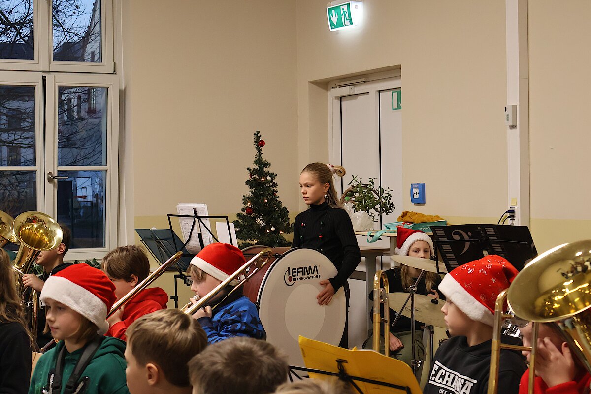 Bei kalten Temperaturen konnte man sich am wärmenden Feuer auf dem Schulhof wunderbar aufwärmen. Im Schulgebäude selbst wurde fleißig musiziert: Die Bläserklasse 5 und 6, unter der Leitung von Janine Gläser, präsentierte wunderschöne Weihnachtslieder. Nach jedem Stück wurde die Gruppe mit großem Applaus belohnt.