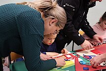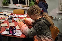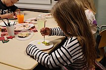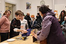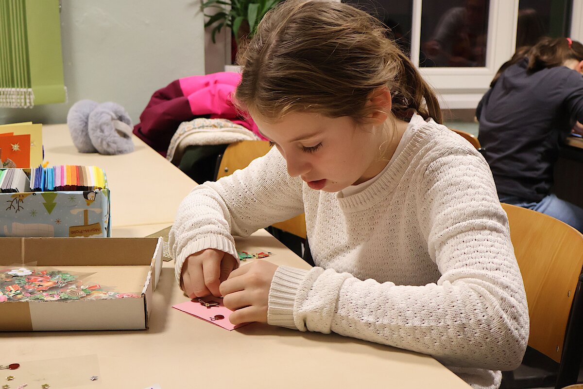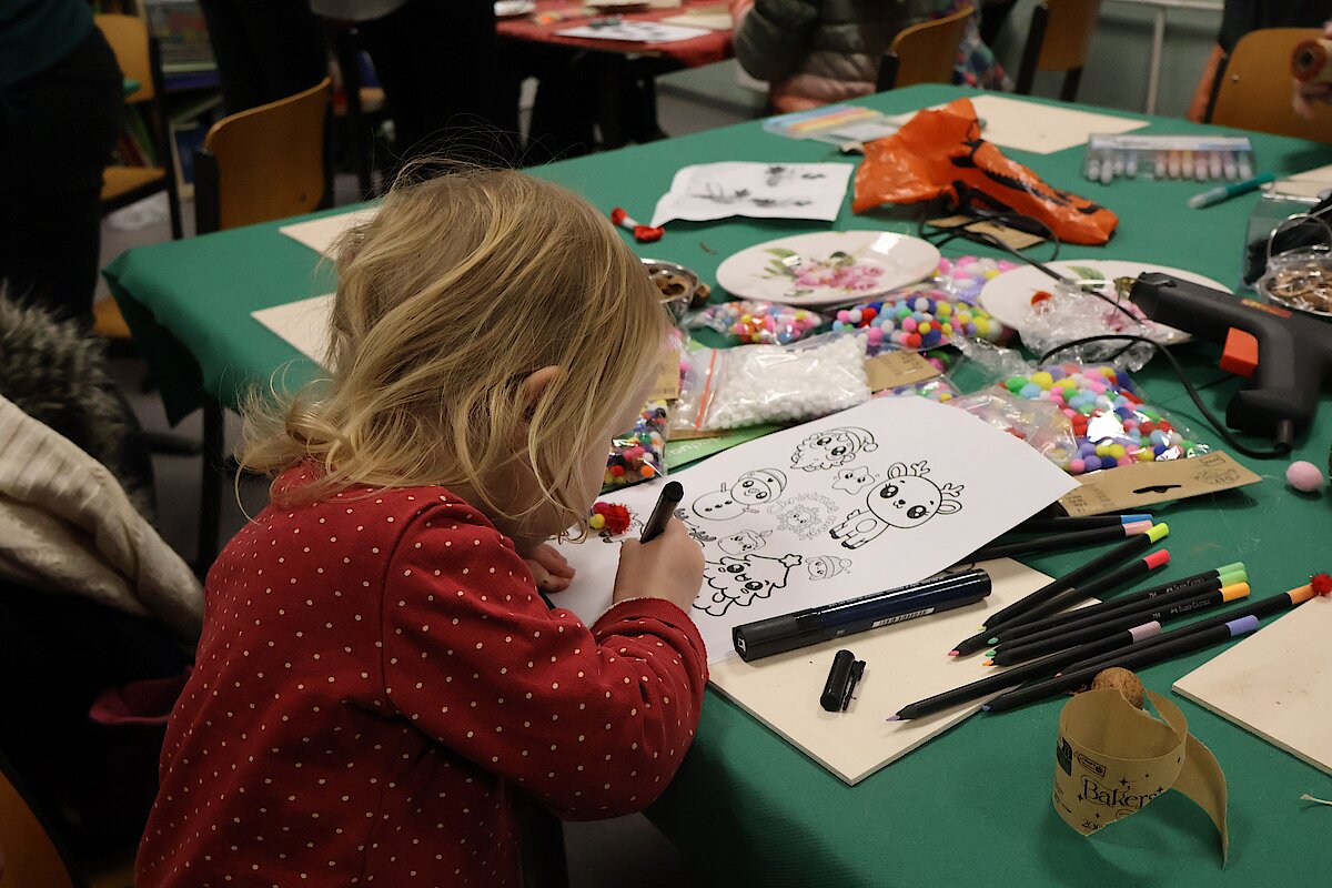 In den Klassenräumen war kreatives Basteln angesagt. Die Eltern der 5. Klasse hatten tolle Bastelideen vorbereitet, bei denen die Kinder mit viel Freude mitmachen konnten. Unsere "Töpferfee" Änne Tanto w war ebenfalls mit von der Partie und bot handgefertigten Weihnachtsbaumschmuck zum Bemalen an. Der süße Duft von frisch gebackenen Waffeln zog durch die Schule, und in der Küche gab es für alle Naschkatzen süße Leckereien.