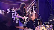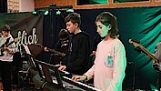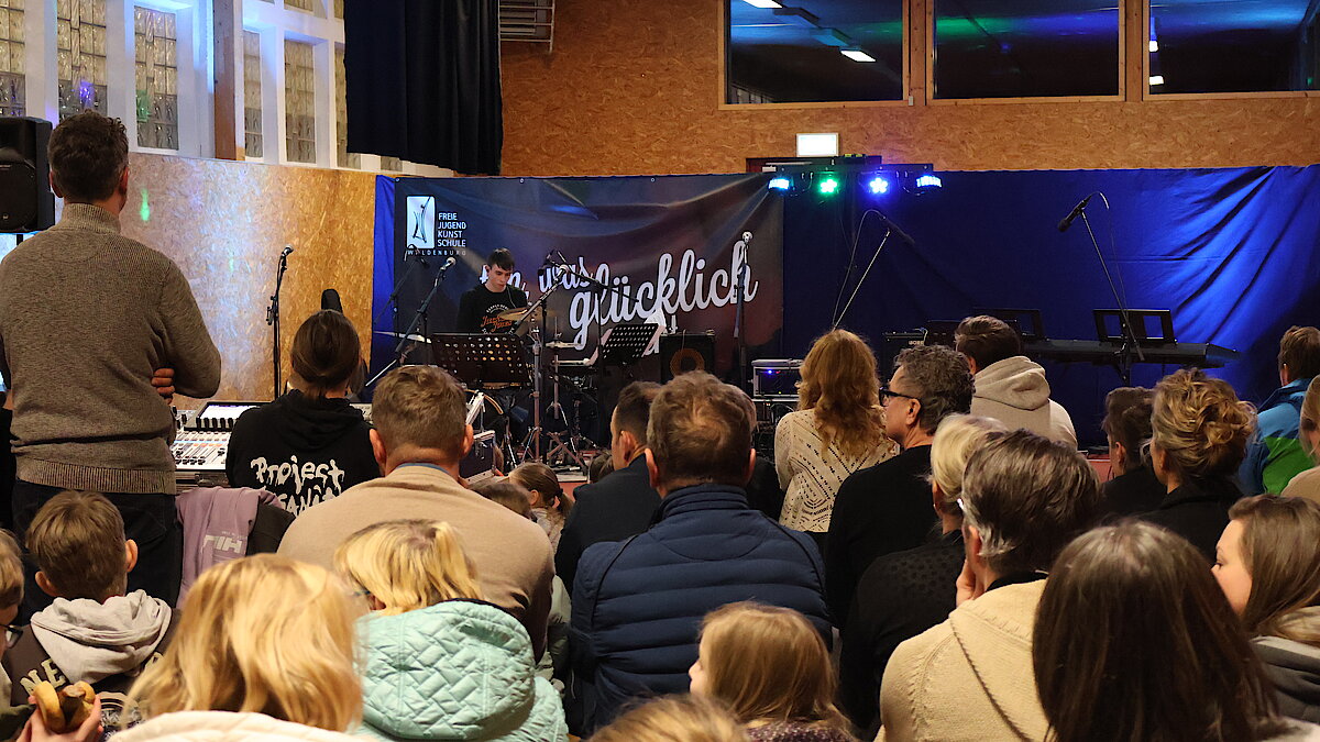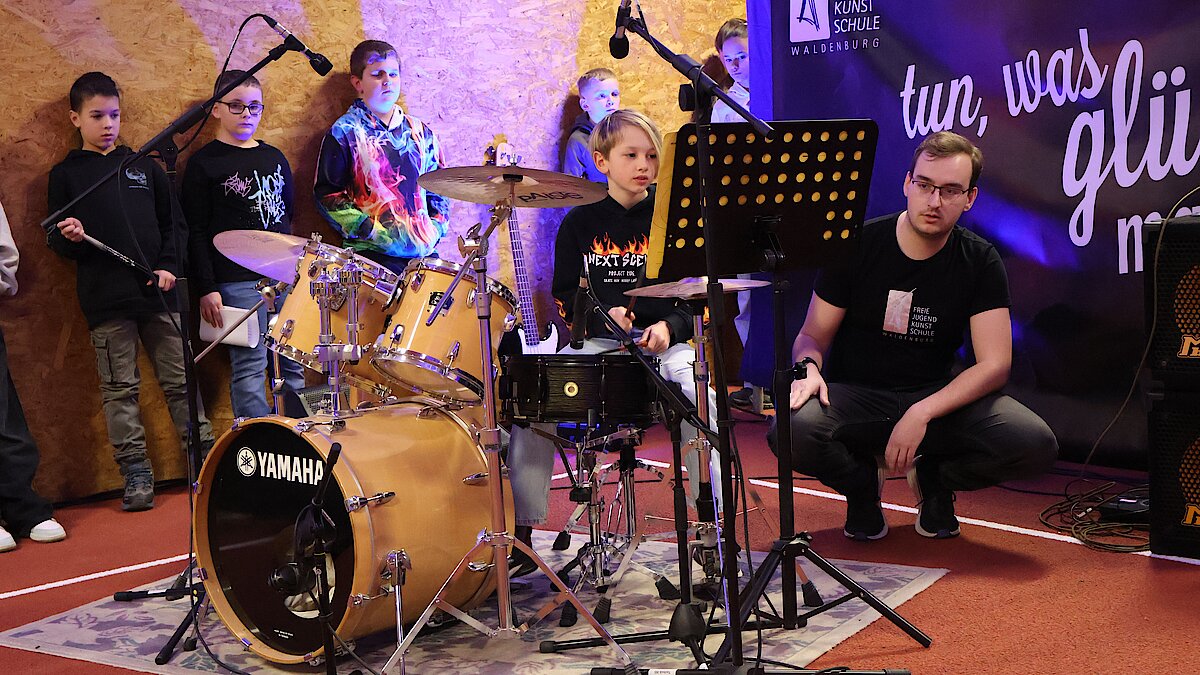 Neben den Schülerinnen und Schülern des Gymnasiums und der Oberschule freute sich das Publikum auch über zwei Schüler der Jugendkunstschule. Julian Süchting, der regelmäßig Schlagzeugunterricht nimmt, zeigte an diesem Abend sein bereits Erlerntes mit einem Song von Linkin Park. Außerdem begeisterte das Ausnahmetalent Jaron Kaden, der im Rahmen der Begabtenförderung unterstützt wird, ebenfalls am Schlagzeug. Mit einer eigenen Komposition und weiteren Stücken unterhielt er das Publikum eindrucksvoll.