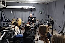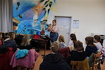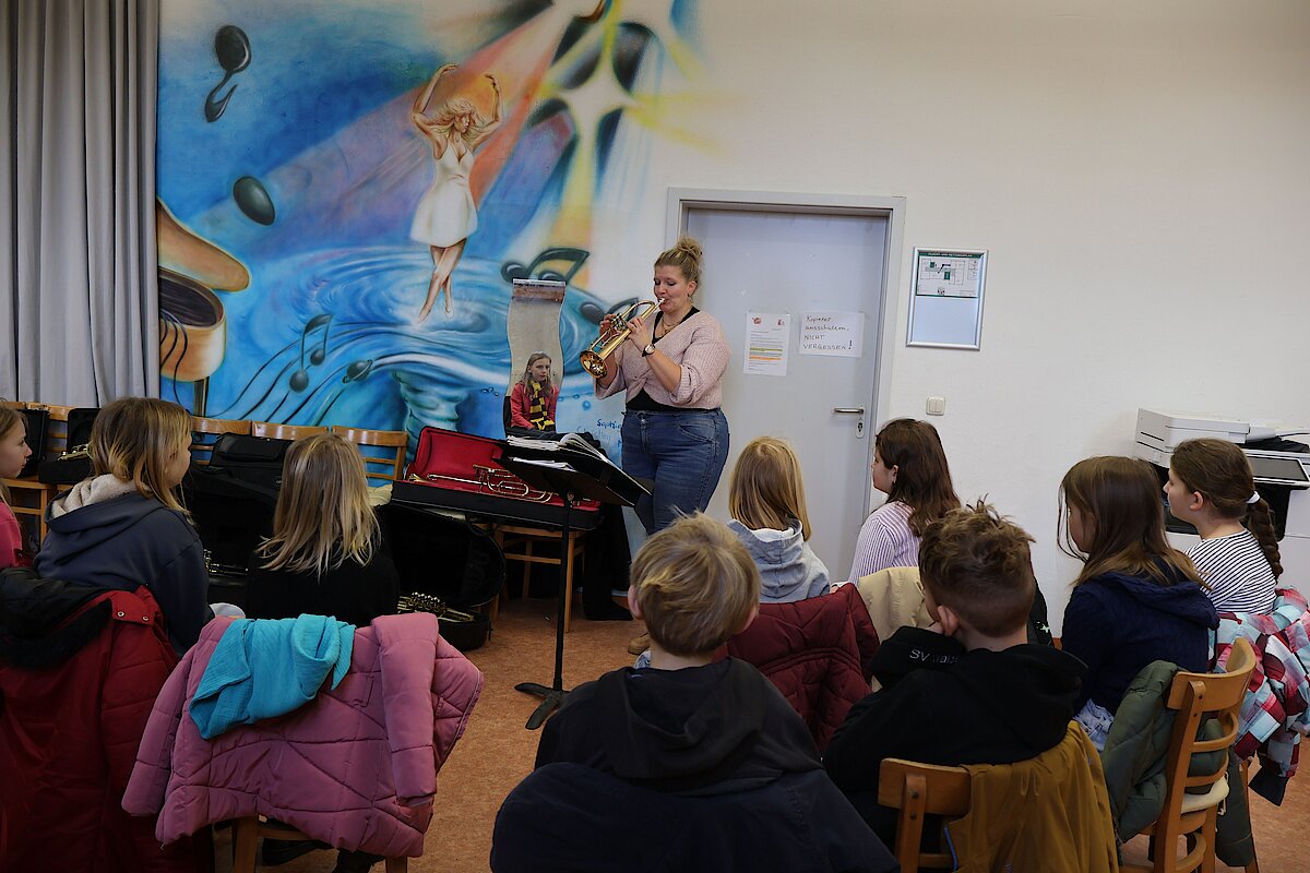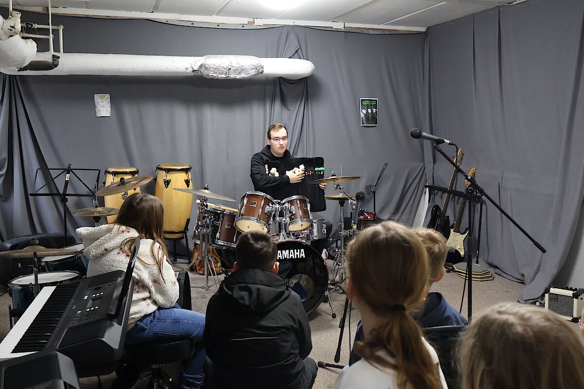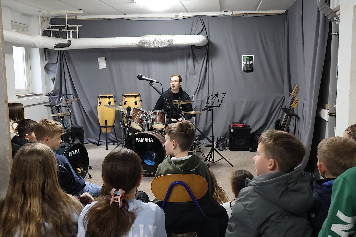In der 1. Klasse stellten Olaf Richter und Uta Geser den Kontrabass und die Flöte vor. Die 2. Klassen lernten gemeinsam mit Frank Neubauer die Gitarre kennen, während sich die 3. Klassen über den Besuch von Wiebke Mankel und ihren Streichinstrumenten freuten. Ein ganz besonderes Highlight erwartete die 4. Klassen: Sie durften die Musiker in der Jugendkunstschule besuchen. Dort zeigte Vincent Rudlof, wie ein Schlagzeug klingt und funktioniert, und Janine Gläser nahm die Kinder mit in die Welt der Blasinstrumente.